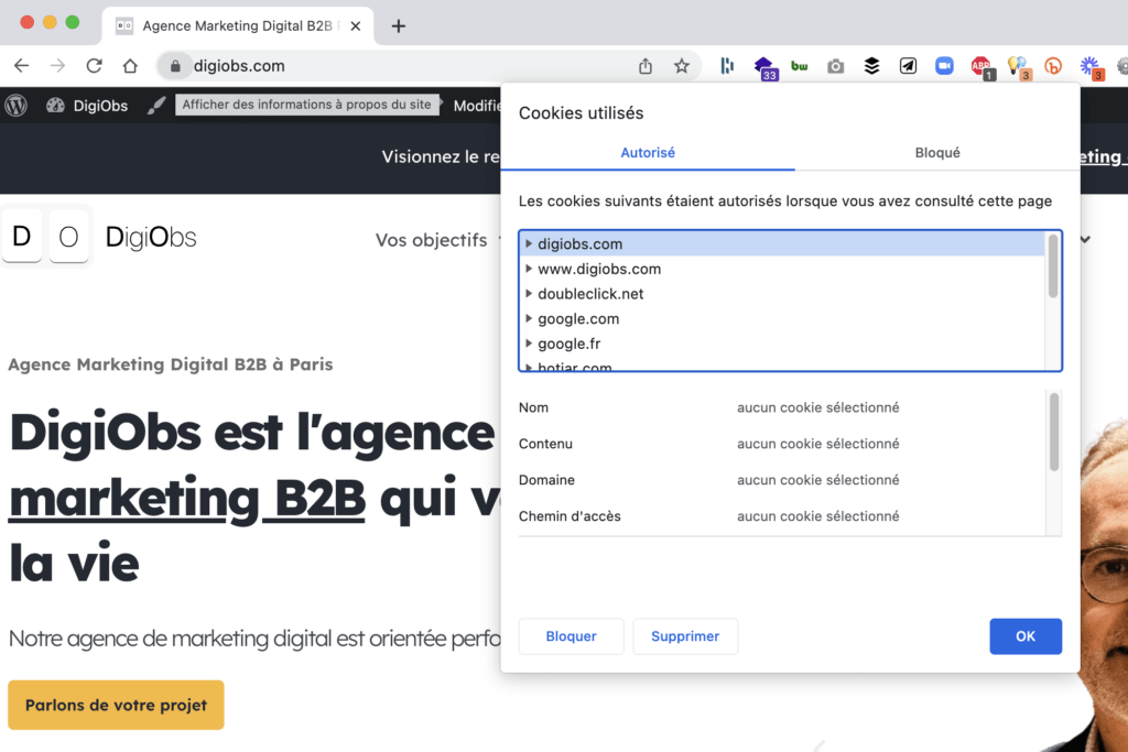 Vous pouvez cliquer sur le cadenas dans l’URL de votre navigateur préféré pour voir tous les cookies installés sur votre site.