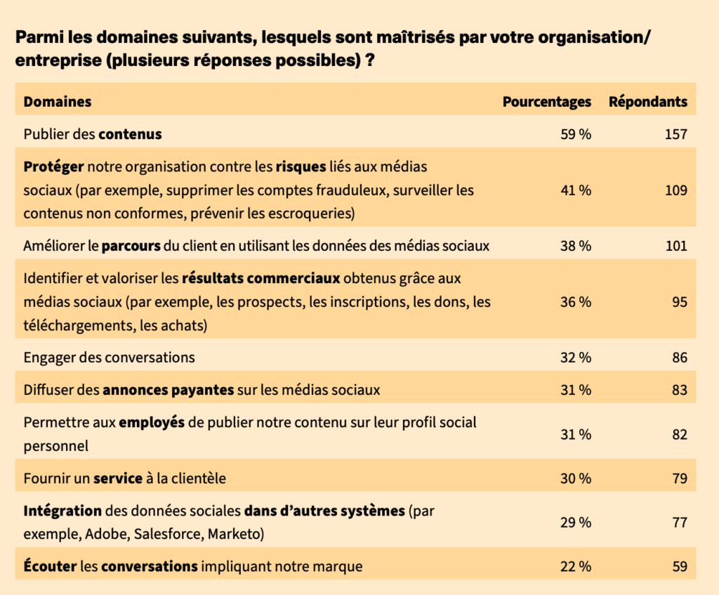 Parmi toutes les activités permettant de tirer pleinement le potentiel des médias sociaux, la création et la publication de contenus est celle qui reste la plus stratégique, donc la plus internalisée dans les entreprises. Ce contenu étant une véritable monnaie d’échange en interne, voir de pouvoir, car révélatrice de la stratégie de l’entreprise et déclinée selon les différents objectifs de l’entreprise. Elle est encore trop peu visée par la direction générale.