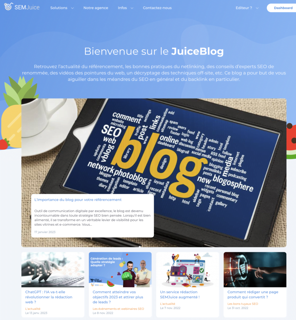 SEMJuice est un blog qui fournit aux lecteurs des informations précieuses sur le référencement et les dernières tendances du marketing numérique. Il couvre des sujets tels que l’optimisation des sites Web, , la création de liens, la recherche de mots clés et plus encore. Le blog présente des articles approfondis rédigés par des professionnels expérimentés qui connaissent bien leur sujet, notamment du netlinking.