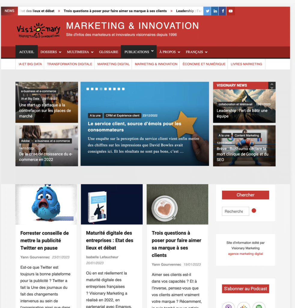 Visionary Marketing est un blog qui aide les professionnels à rester à la pointe des tendances modernes en matière de marketing de contenus. Animé par Yann Gourvennec depuis près de 25 ans il fournit des conseils et des astuces sur les stratégies de contenus BtoB innovantes – sur des sujets allant de l’utilisation des médias sociaux à la rédaction de livres blancs – permettant aux entreprises de se démarquer de leurs concurrents.